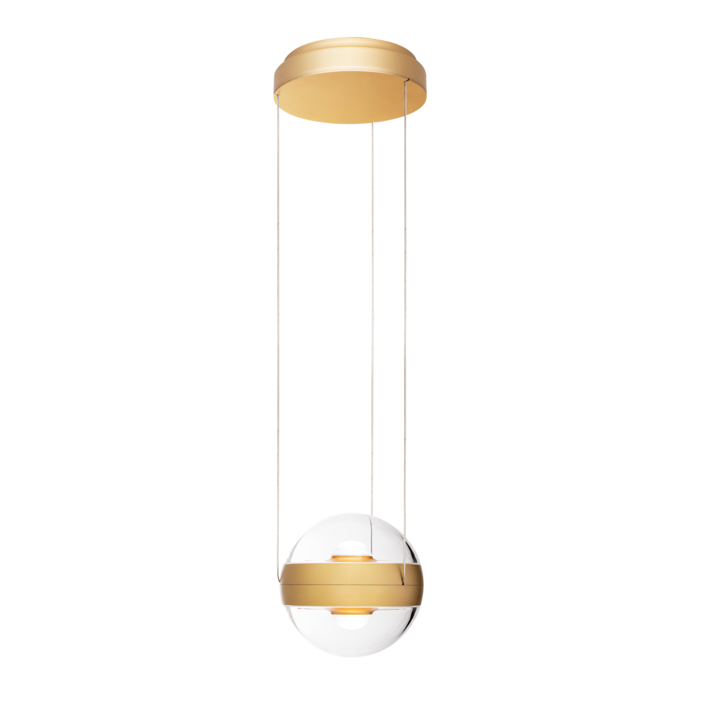 Een dubbele binnenhanglamp voor direct en indirect licht. Kan worden gedimd met traditionele bedieningselementen en Casambi. Verkrijgbaar in wit, mat goud en zilver, met transparante methacrylaatkoepels met focuslenzen voor accentverlichting of opaalachtige lenzen voor zachte diffuse verlichting. De hoge kleurweergave-index (CRI) van de lamp garandeert een goede kleurweergave en correct omgevingslicht. Er is een plafondrozetaccessoire verkrijgbaar waarmee meerdere armaturen in serie kunnen worden aangesloten.
