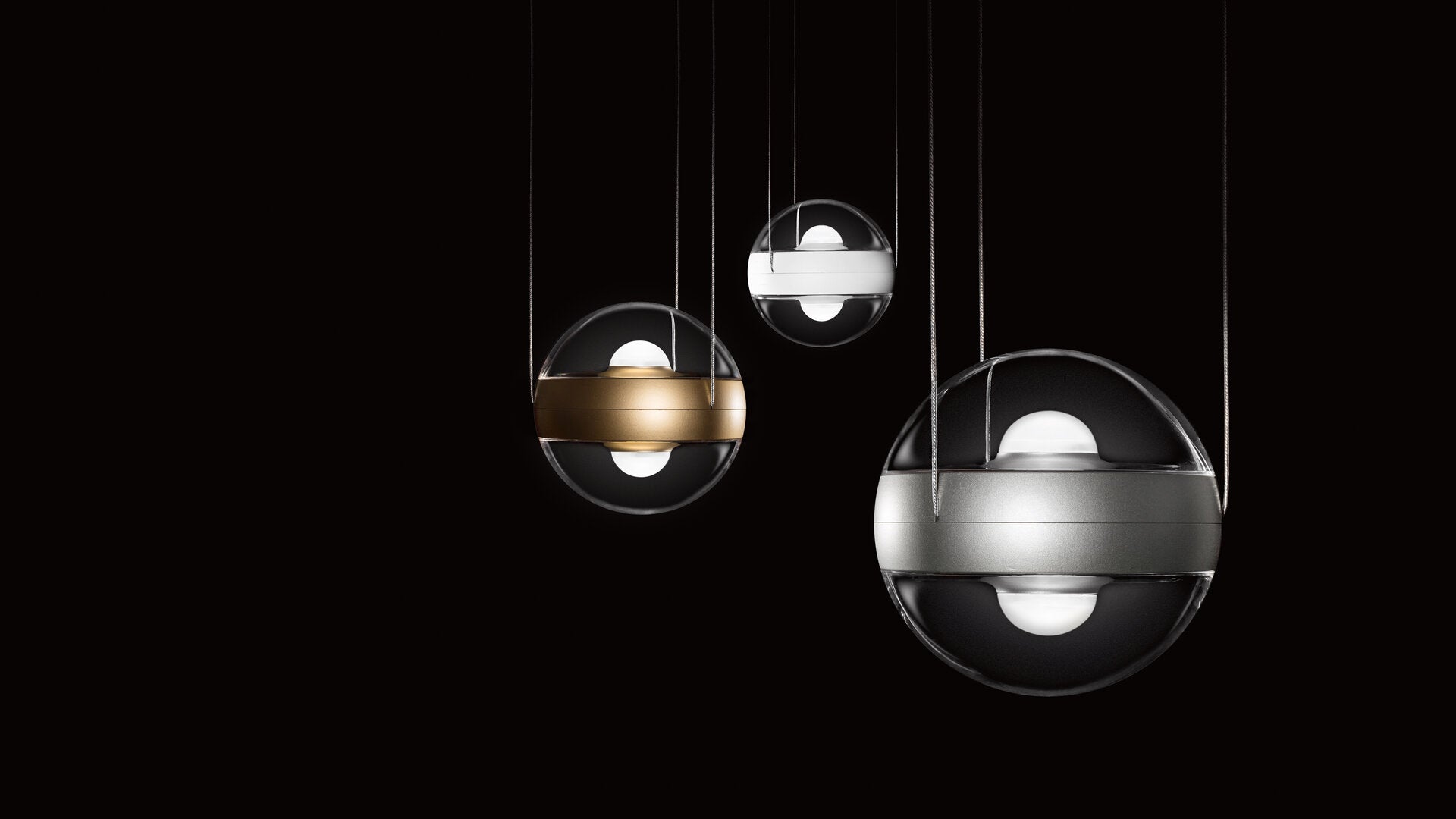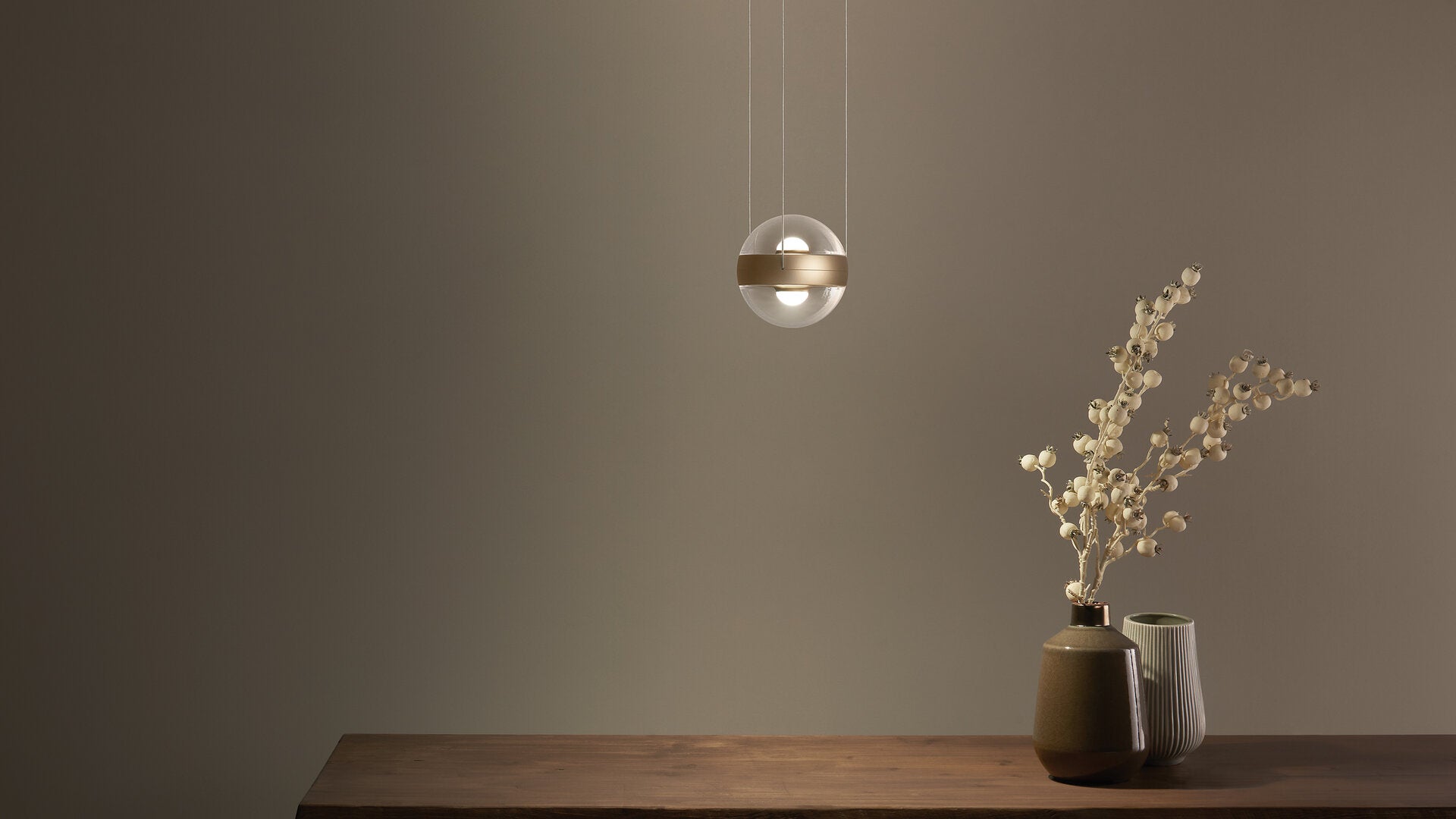 Een dubbele binnenhanglamp voor direct en indirect licht. Kan worden gedimd met traditionele bedieningselementen en Casambi. Verkrijgbaar in wit, mat goud en zilver, met transparante methacrylaatkoepels met focuslenzen voor accentverlichting of opaalachtige lenzen voor zachte diffuse verlichting. De hoge kleurweergave-index (CRI) van de lamp garandeert een goede kleurweergave en correct omgevingslicht. Er is een plafondrozetaccessoire verkrijgbaar waarmee meerdere armaturen in serie kunnen worden aangesloten.