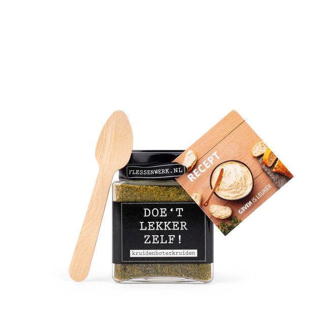 Een potje kruidenbotermix met een handige bamboe lepel. Op het etiket staat de tekst 'Doe 't lekker zelf!'. Naast kruidenboter kun je hier ook kruidenolie van maken. Het enige wat je hoeft te doen is dit toe te voegen aan je boter of olie.